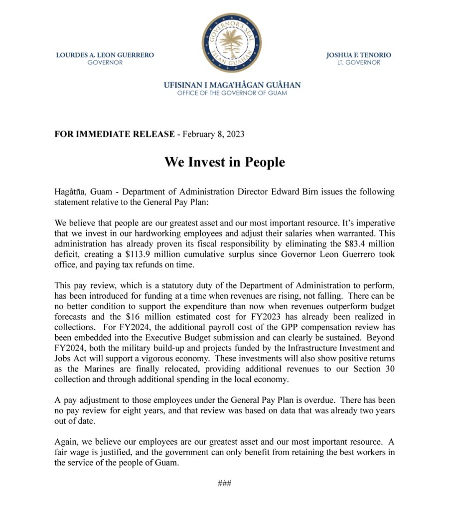 Keep in mind that since the last pay raise in 2014, the cost of living has risen substantially, especially during the 7.8% spike in prices caused by a combination of supply chain challenges, the covid pandemic and profit-gouging by large corporations. Are GovGuam workers expected to bear the extra costs of living plus be saddled with the costs of repairing public schools by being denied a routine increase in their compensation? Uncompetitive wages in GovGuam have already strained efforts to recruit and retain workers.